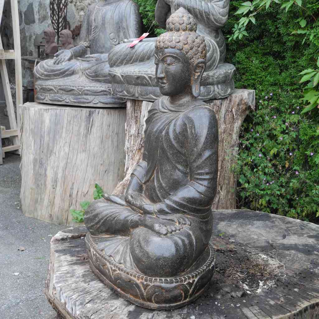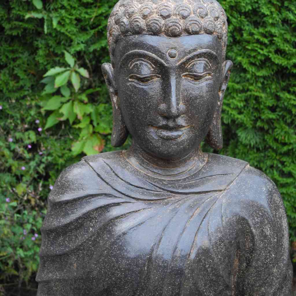 Ein Schmuckstück für Haus oder Garten ist diese filigrane Buddha Statue in Meditation aus patiniertem Fluss Stein.